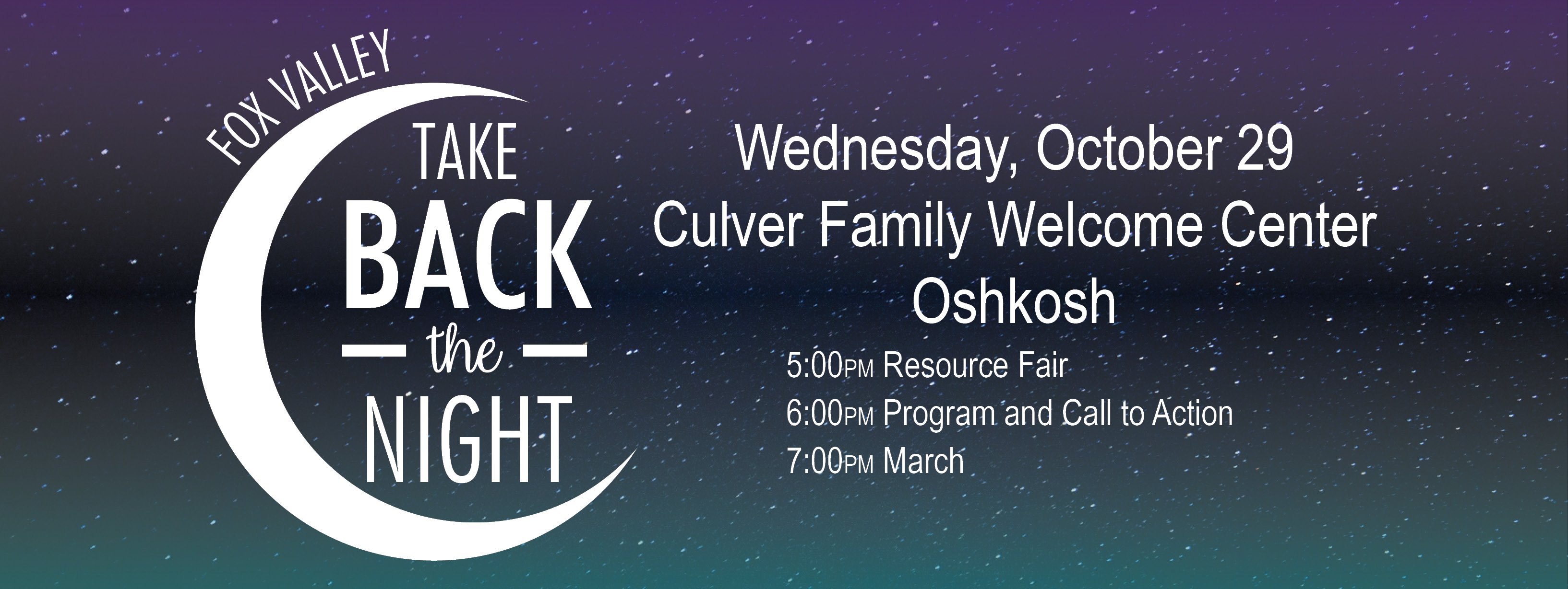 Fox Valley Take Back the Night is an annual event that provides attendees with the opportunity to become educated on and take a stand against sexual assault and domestic abuse in our community. Join us for all or part of the event.